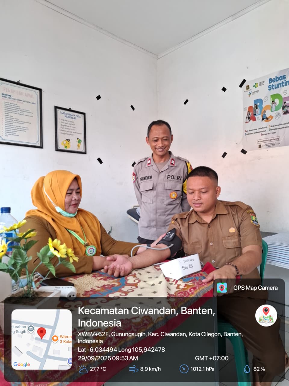 Cilegon - Dalam rangka mendukung program kesehatan masyarakat, Bhabinkamtibmas Kelurahan Gunung Sugih Polsek Ciwandan Polres Cilegon Polda Banten AIPTU Tri Widodo menyambangi kegiatan Dalam Rangka Memperingati Haru Tuberkulosis sedunia yang diselenggarakan di Lingkungan Kelurahan Gunung Sugih Kecamatan Ciwandan Kota Cilegon, (03/10/2025).
