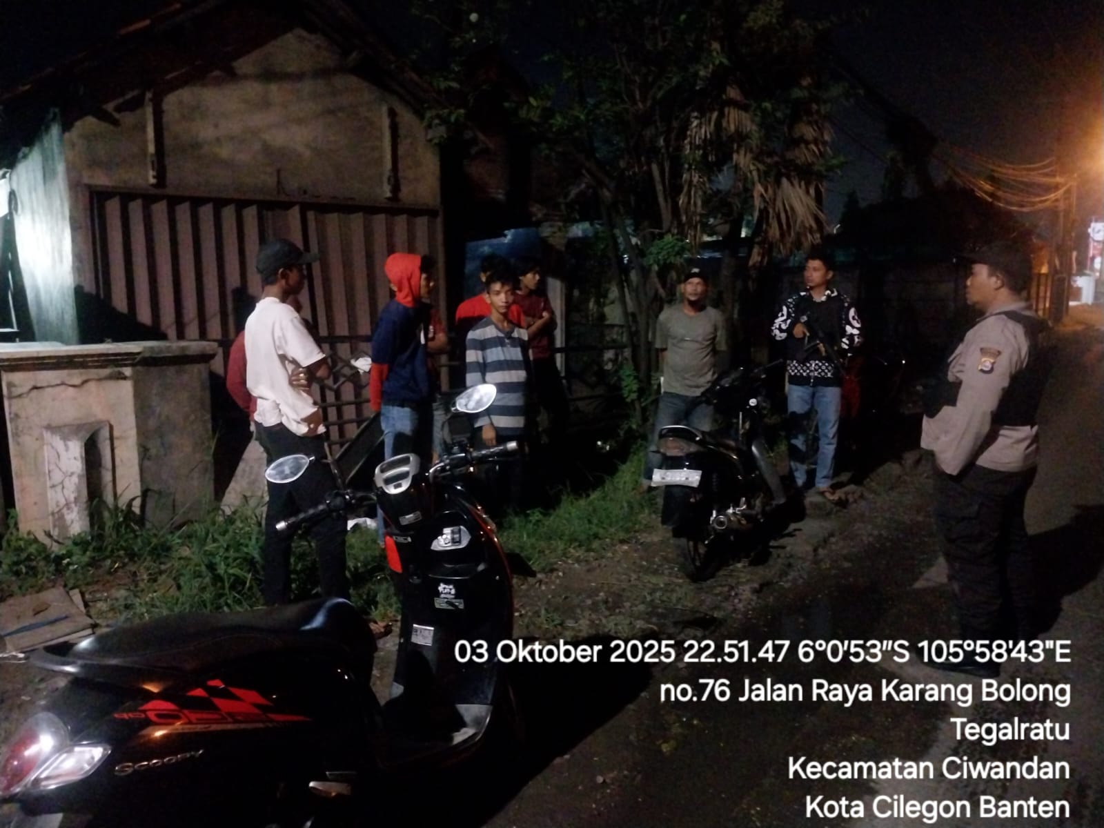 Cilegon - Personil Polsek Ciwandan Polres Cilegon Polda Banten melakukan patroli malam yang bertujuan untuk mengantisipasi adanya aktivitas balap liar dan tawuran kelompok geng motor di daerah hukum Polsek Ciwandan Polres Cilegon Polda Banten, Sabtu (04/10/2025).