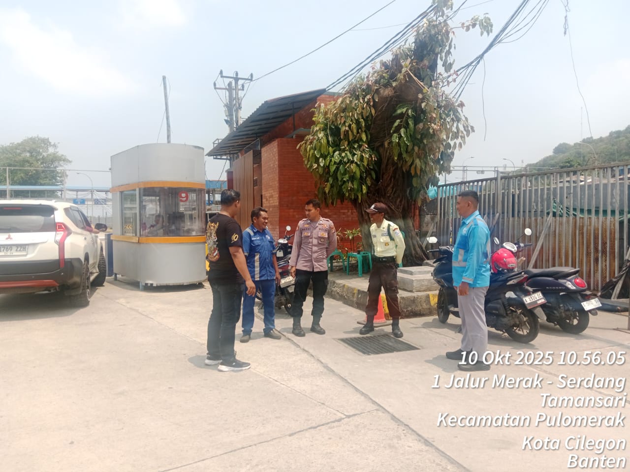Cilegon - Personel Polsek Kskp Merak Polres Cilegon Polda Banten melaksanakan sambang dan patroli kawasan pelabuhan merak dalam rangka menjaga Harkamtibmas di Kawasan Pelabuhan Merak, Jumat (10/10/2025).