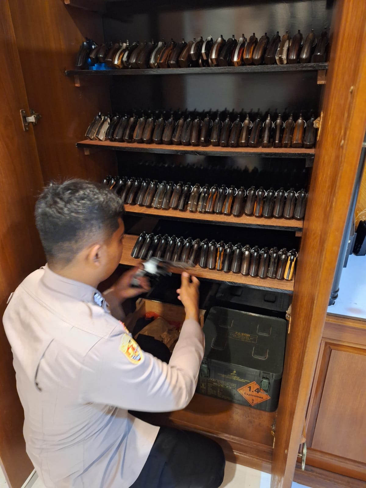 STAFF LOGISTIK MEMBERSIHKAN SENJATA API DI GUDANG