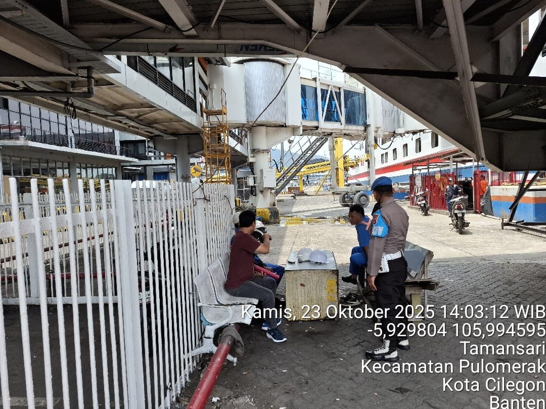 Cilegon - Personel Polsek Kskp Merak Polres Cilegon Polda Banten melaksanakan sambang dan patroli kawasan pelabuhan merak dalam rangka menjaga Harkamtibmas di Kawasan Pelabuhan Merak, Kamis (23/10/2025).