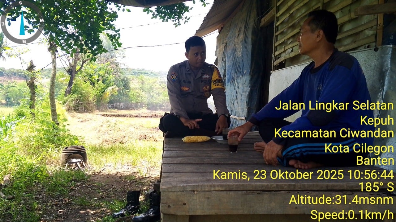 Cilegon - Bhabinkamtibmas Kelurahan Kepuh Polsek Ciwandan Polres Cilegon Polda Banten AIPDA Mere Erlansyah Menyapa warga serta Ajak warga Binaannya untuk berperan aktif jaga keamanan lingkungan serta jalin komunikasi agar tercipta situasi aman di daerah hukum Polsek Ciwandan Polres Cilegon Polda Banten, Kamis (23/10/2025).