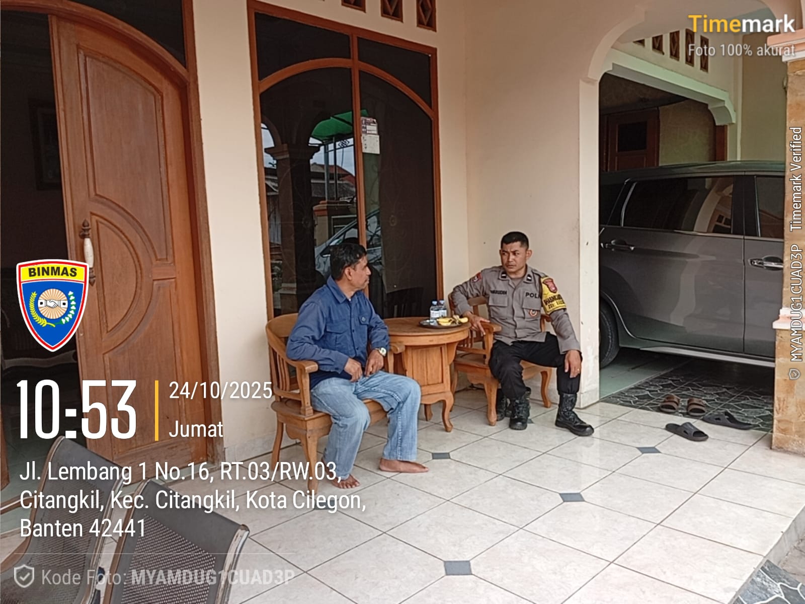 Cilegon - Bhabinkamtibmas Polsek Ciwandan Polres Cilegon Polda Banten  Melaksanakan kegiatan Dialogis/Sambang Door to Door Sistem (DDS) Di daerah binaannya serta memberikan Pesan-pesan Kamtibmas Guna Menciptakan situasi Harkamtibmas yang Aman dan nyaman, Sabtu (25/10/2025).