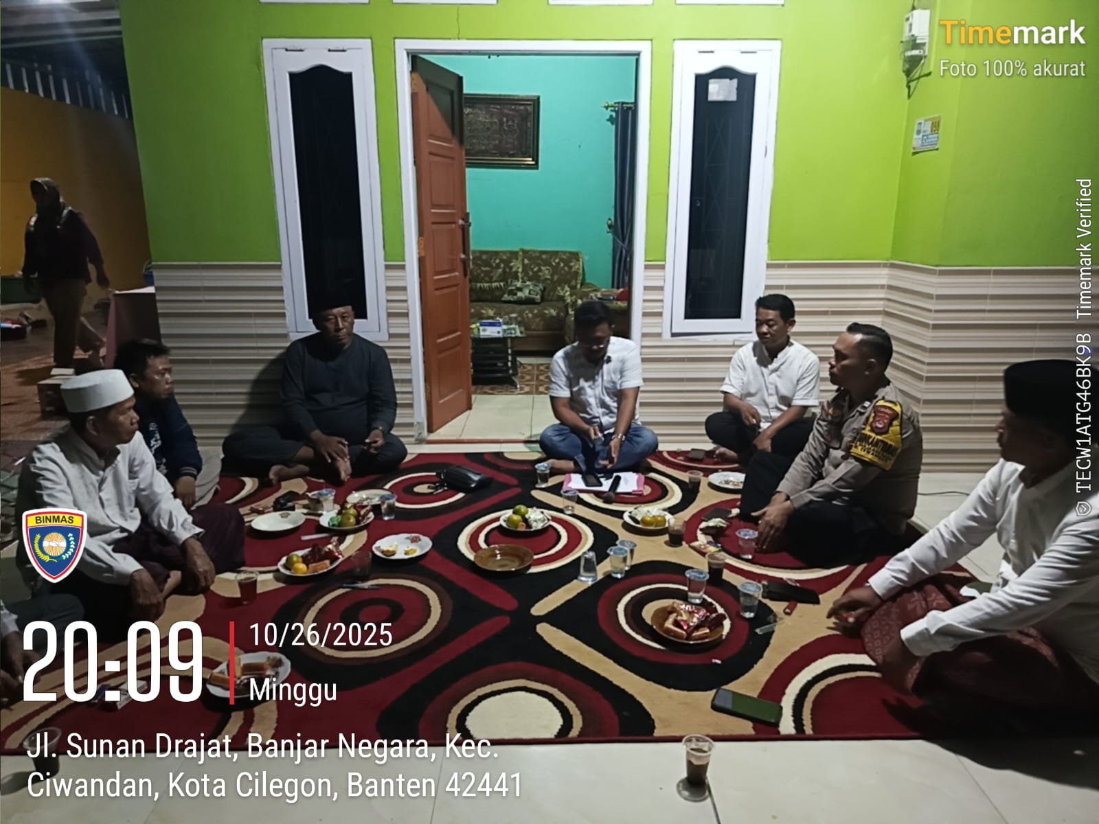 Cilegon - Bhabinkamtibmas Polsek Ciwandan Polres Cilegon Polda Banten menghadiri kegiatan Doa Bersama dan Dilanjutkan Pengajian Rutin dilingkungan Kelurahan Banjarnegara Kecamatan Ciwandan Kota Cilegon, Senin (27/10/2025).