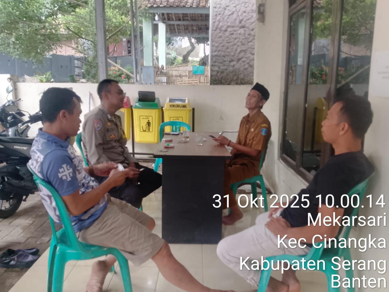 *CILEGON* dalam Rangka Mengantisipasi Gktm di wilayah Personil Bhabinkamtibmas Cinangka melakukan patroli Dialogis dengan Kepala Desa dan warga dan Menanyakan situasi Kamtibmas di wilayah dalam Rangka Menjaga Harkamtibmas di Desa Binaannya Kecamatan Cinangka Kab. Serang. Jumat.(31/10/2025).