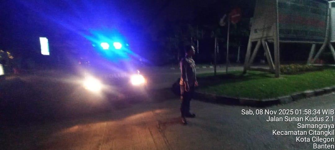 Cilegon - Personil Polsek Ciwandan Polres Cilegon Polda Banten Dalam Pelaksanaan Kegiatan Patroli dengan menyalakan lampu rotator berwarna biru di Daerah Hukum Polsek Ciwandan Polres Cilegon Polda Banten dari malam hingga dini hari, dalam rangka menciptakan situasi aman dan kondusif, Sabtu (08/11/2025).