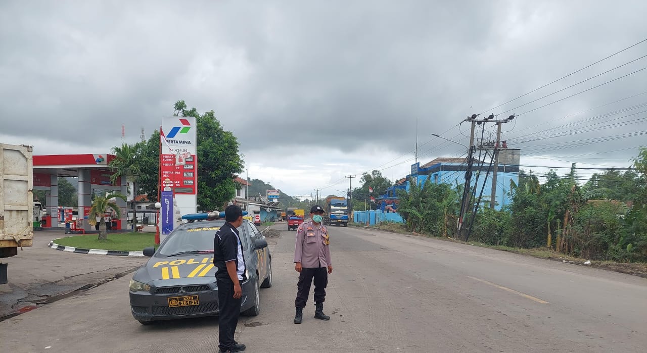 Giat Pengaturan Lalin di Depan SPBU Bojonegara, Anggota Polsek Bojonegara Laksanakan Strong Poin Sore Hari