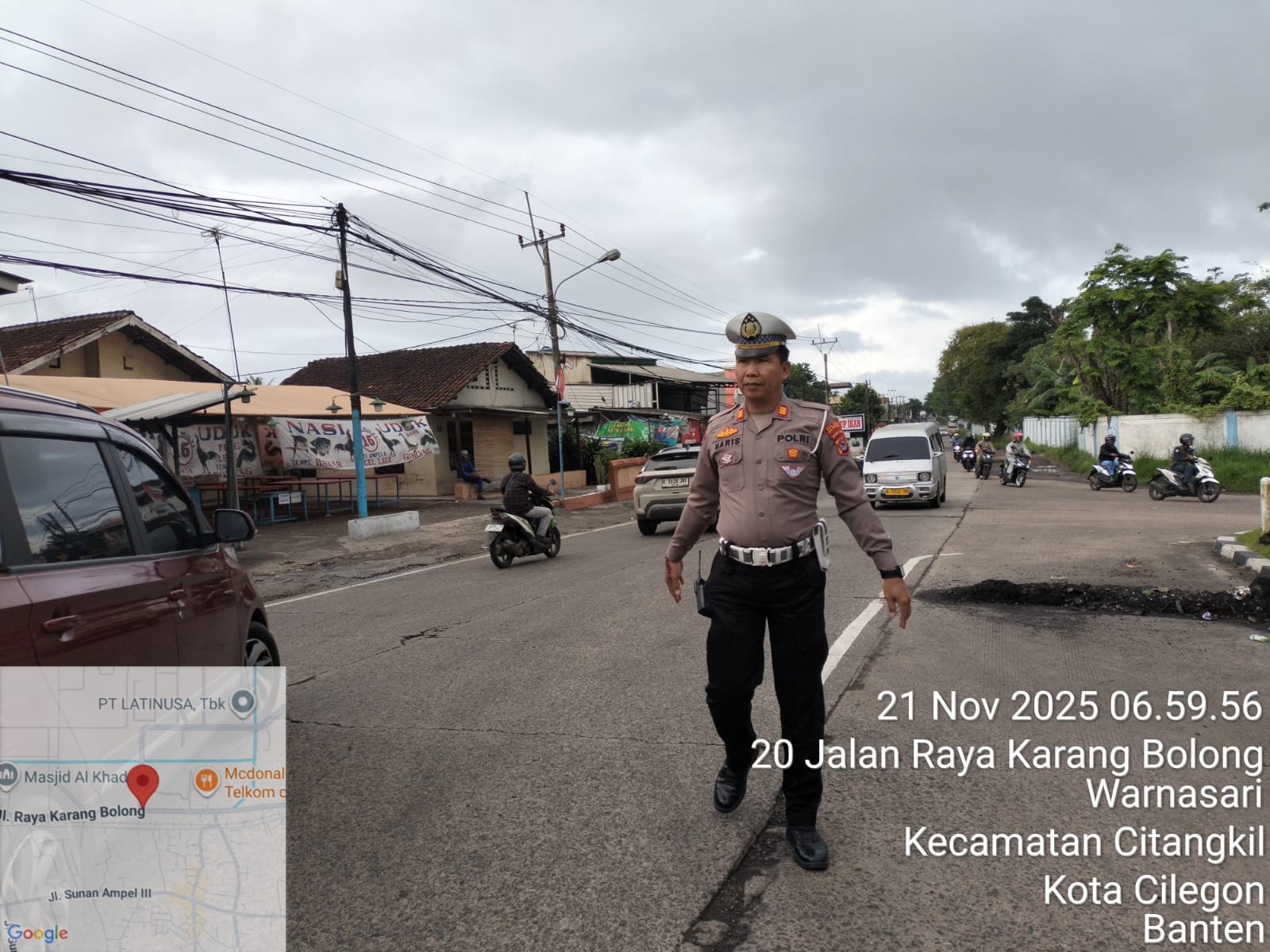 Cilegon - Pelayanan Prima Kepolisian Kepada Warga Masyarakat dan Guna menciptakan situasi lalu lintas yang aman, tertib dan lancar, Personel Unit Lantas Polsek Ciwandan Polres Cilegon Polda Banten secara rutin melaksanakan pengaturan lalu lintas, Jum'at (21/11/2025).