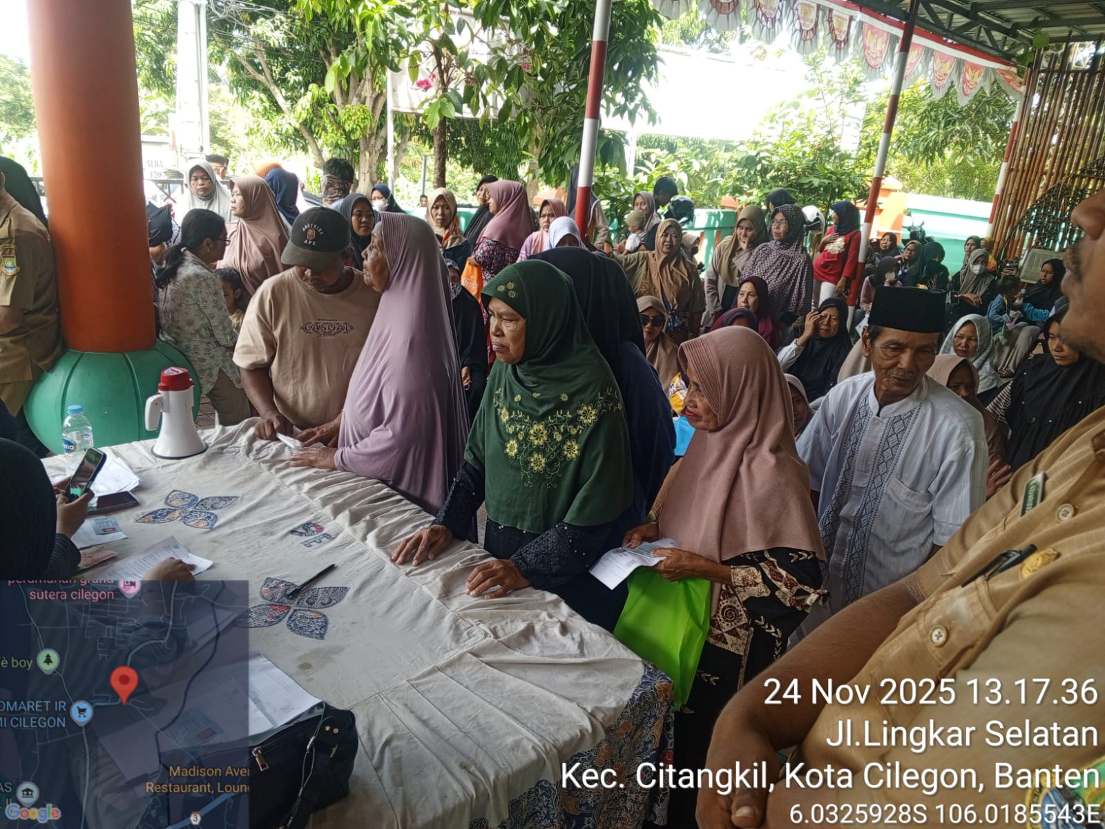 Cilegon - Bhabinkamtibmas Kelurahan Lebak Denok, AIPTU YUDI SETIAWAN, melaksanakan pengamanan dan monitoring bantuan langsung tunai dari Kementerian Sosial RI di Kantor Kelurahan Lebak Denok, Kecamatan Citangkil, Kota Cilegon, Senin (24/11/2025).