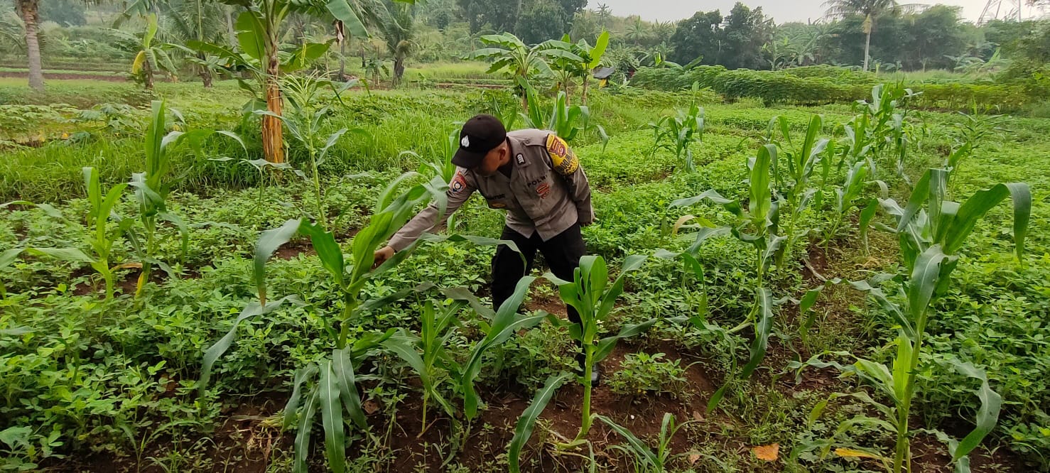 Bhabinkamtibmas Kelurahan Kota Bumi, Bripka Agustoni, melaksanakan pengecekan tanaman jagung di wilayah binaannya