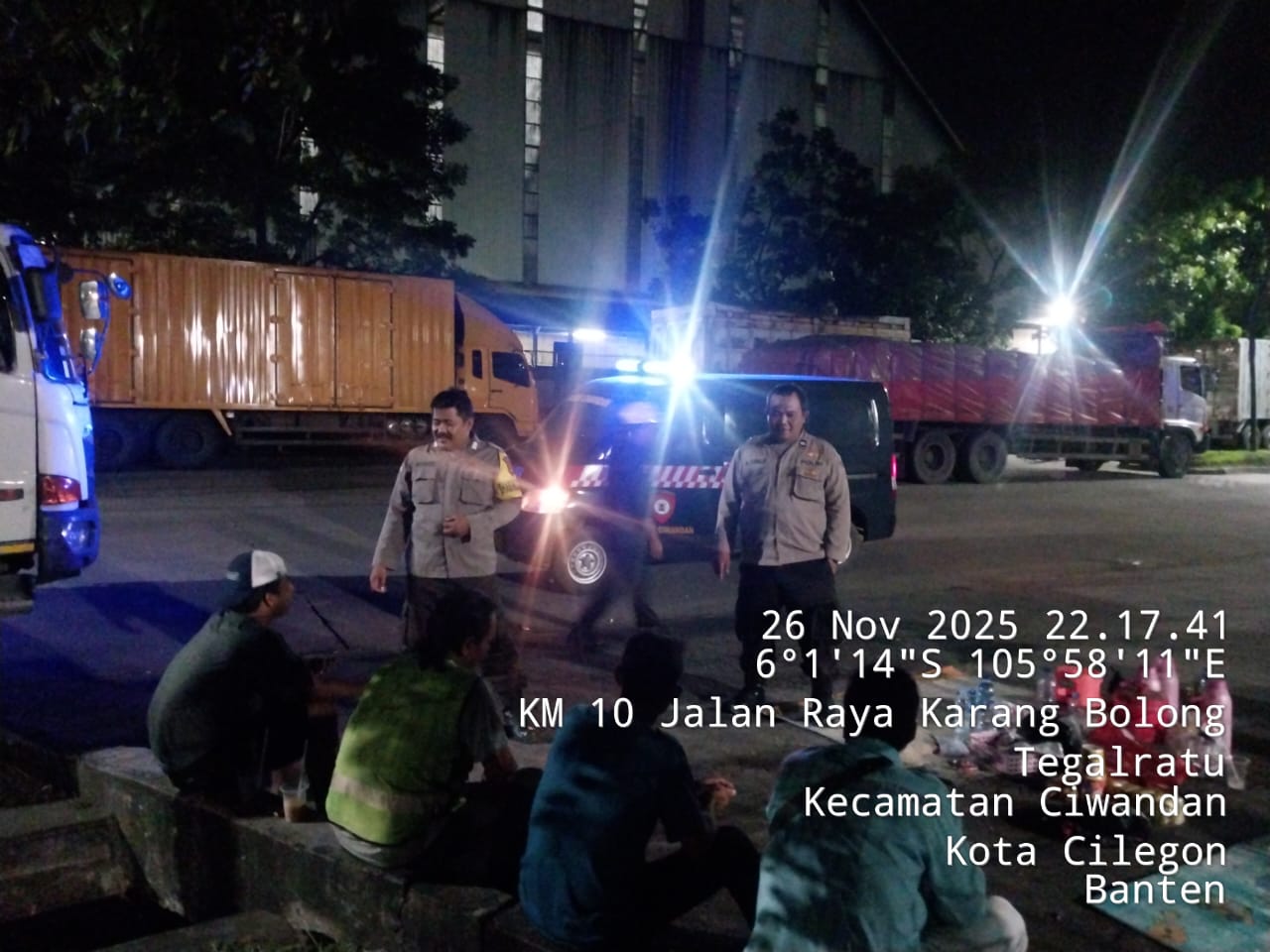 Cilegon - Personil Polsek Ciwandan Polres Cilegon Polda Banten Dalam Pelaksanaan Kegiatan Patroli dengan menyalakan lampu rotator berwarna biru di Daerah Hukum Polsek Ciwandan Polres Cilegon Polda Banten dari malam hingga dini hari, dalam rangka menciptakan situasi aman dan kondusif, Kamis (27/11/2025).