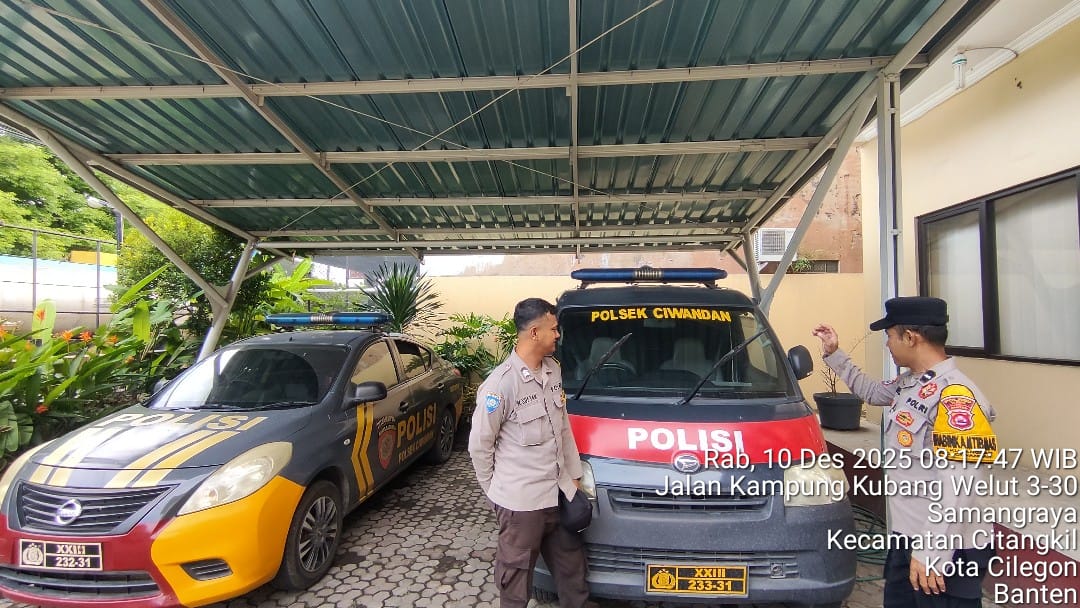 Cilegon - Ka SPKT Polsek Ciwandan Polres Cilegon Polda Banten Pimpin langsung pengecekan kendaraan Dinas Dan Inventaris Polsek Ciwandan Saat Serah terima Tugas Penjagaan, khususnya mobil patroli, Selasa (09/12/2025).