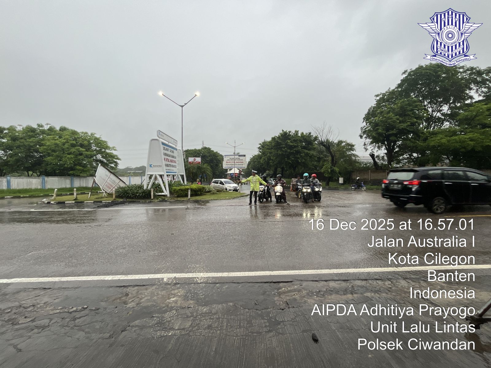 Cilegon - Guna Kelancaran Lalu-lintas Personil Unit Lantas Polsek Ciwandan Polres Cilegon Polda Banten melaksanakan pengaturan lalu-lintas di Simpang Beringin Ciwandan Pertigaan Kawasan Industri KSP/ KIEC I  kelurahan Warnasari Kecamatan Citangkil Kota Cilegon, Rabu (17/12/2025).