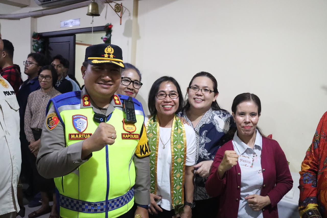 Forkopimda turut menyampaikan ucapan selamat Natal kepada jemaat serta membagikan bunga dan bingkisan sebagai bentuk perhatian dan simbol damai Natal. Respons hangat dan penuh sukacita terlihat dari para jemaat yang menyambut langsung pemberian tersebut.
