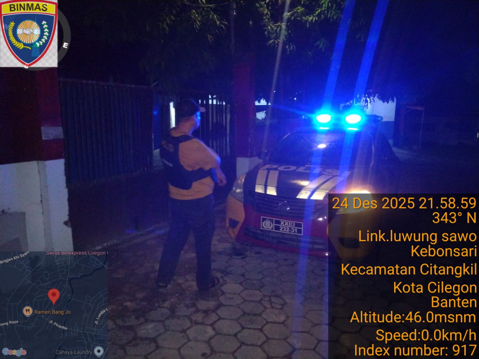Cilegon - Personil Polsek Ciwandan Polres Cilegon Polda Banten Dalam Pelaksanaan Kegiatan Patroli dengan menyalakan lampu rotator berwarna biru di Daerah Hukum Polsek Ciwandan Polres Cilegon Polda Banten dari malam hingga dini hari, dalam rangka menciptakan situasi aman dan kondusif, Kamis (25/12/2025).