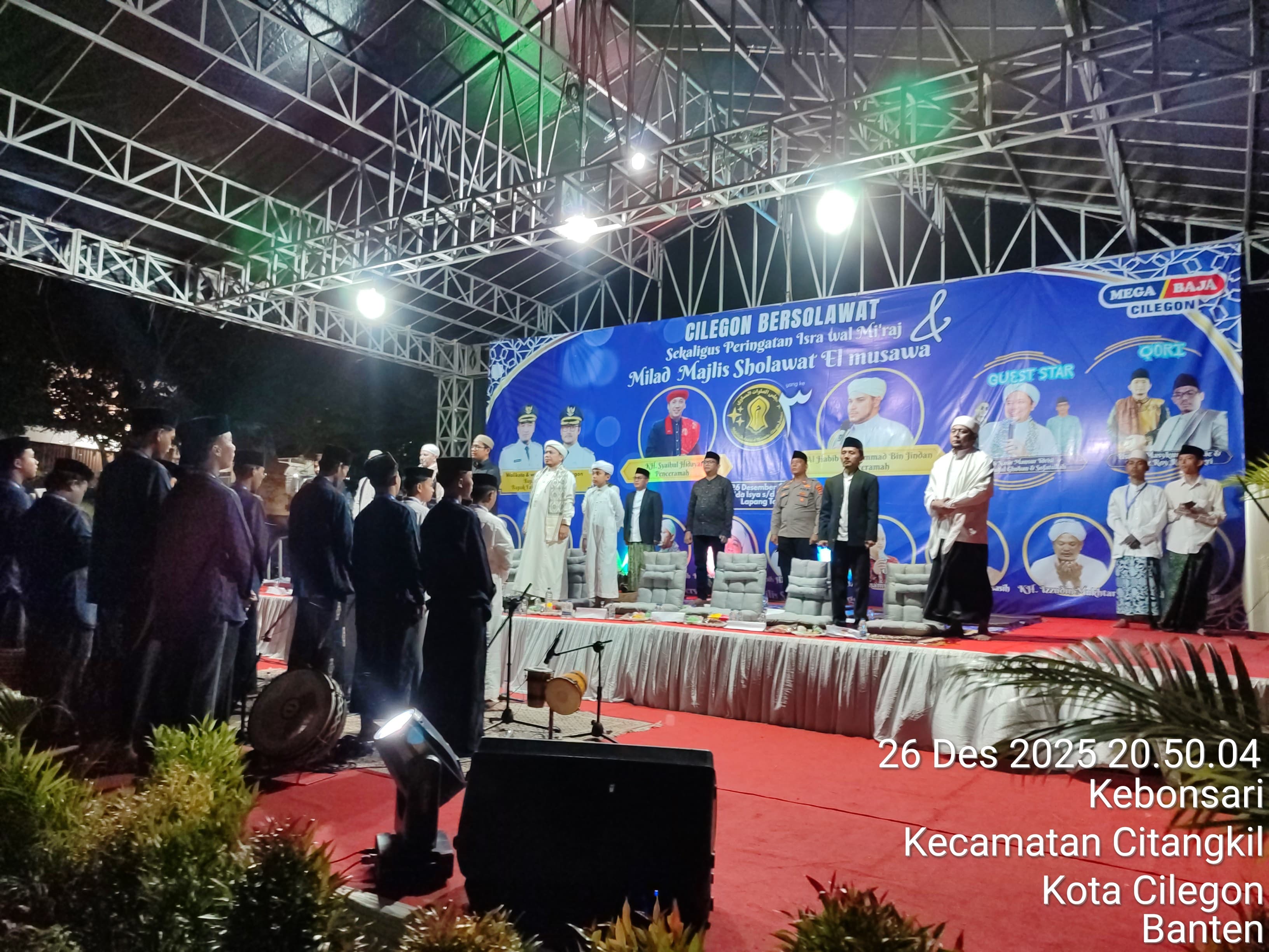 Cilegon - Polres Cilegon melalui Polsek Ciwandan melaksanakan monitoring kegiatan Gema Cilegon Bersholawat dalam rangka Majlis Sholawat El-Musawa ke-3 dan peringatan Isro Mi'raj Nabi Muhammad SAW di Lapangan Tong Alamat, Kebon Sari, Citangkil, Minggu (28/12/2025).