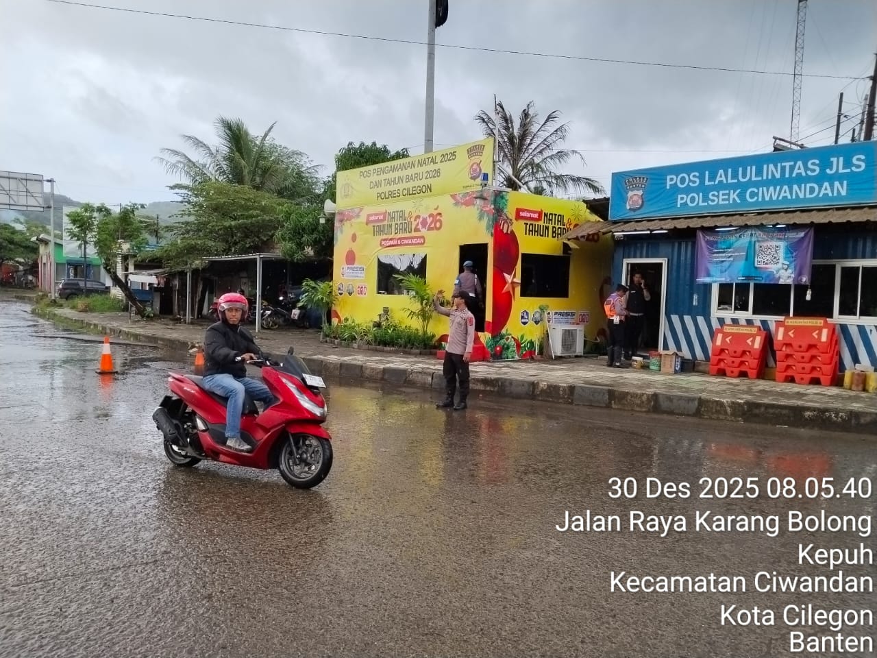 Cilegon - Personil Pos Pam 5 Polsek Ciwandan Polres Cilegon Polda Banten melaksanakan kegiatan pengaturan lalu-lintas dalam pengamanan Libur Natal 2025 Dan Tahun Baru 2026. Selasa (30/12/2025).