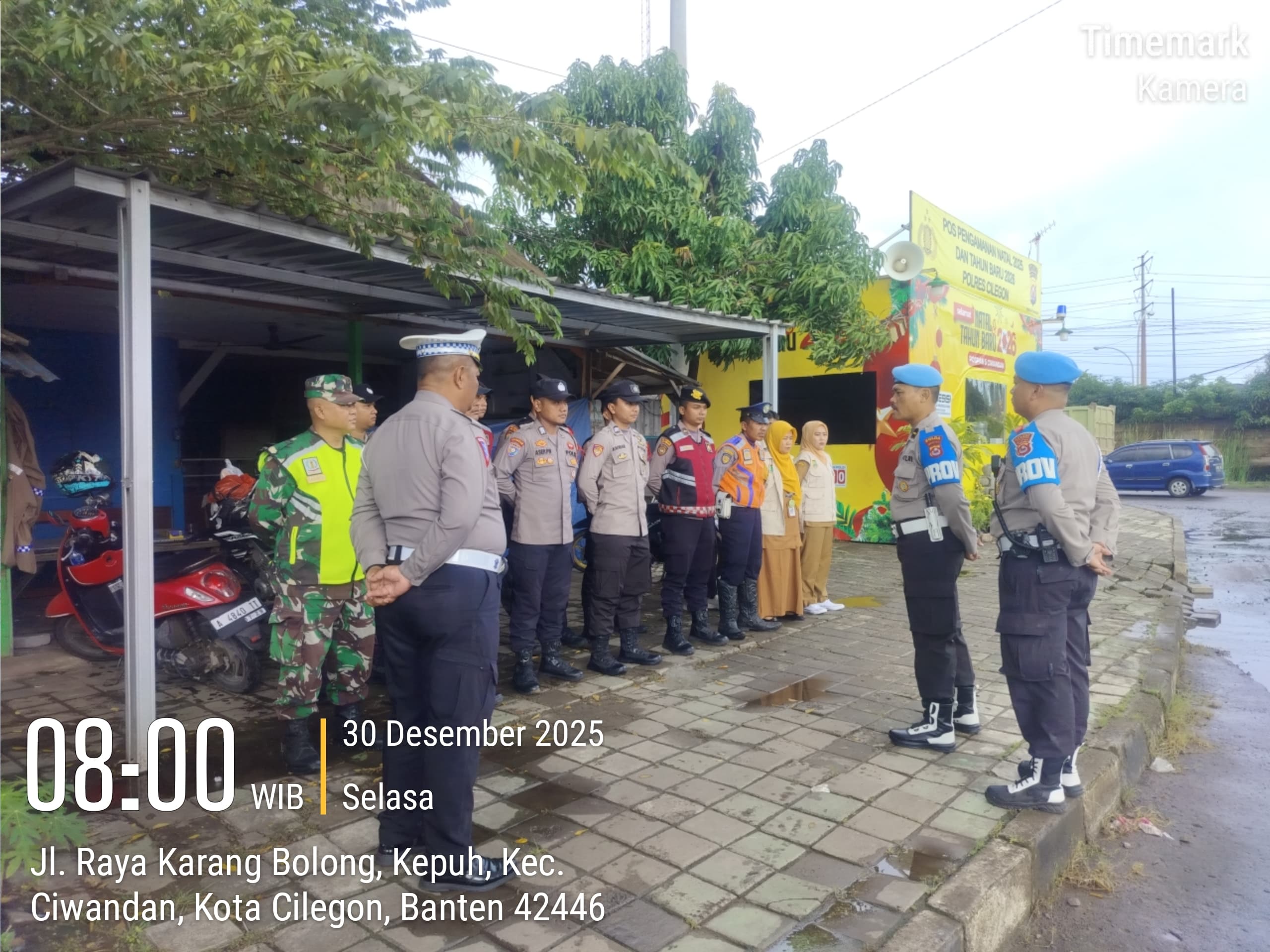 Cilegon - Personil Pospam 5 Ciwandan Polsek Ciwandan Polres Cilegon Polda Banten melaksanakan Apel Kesiapan Pelaksanaan kegiatan pengamanan Arus Lalu-lintas Wisata Dalan Operasi Lilin Maung 2025, Selasa (30/12/2025).
