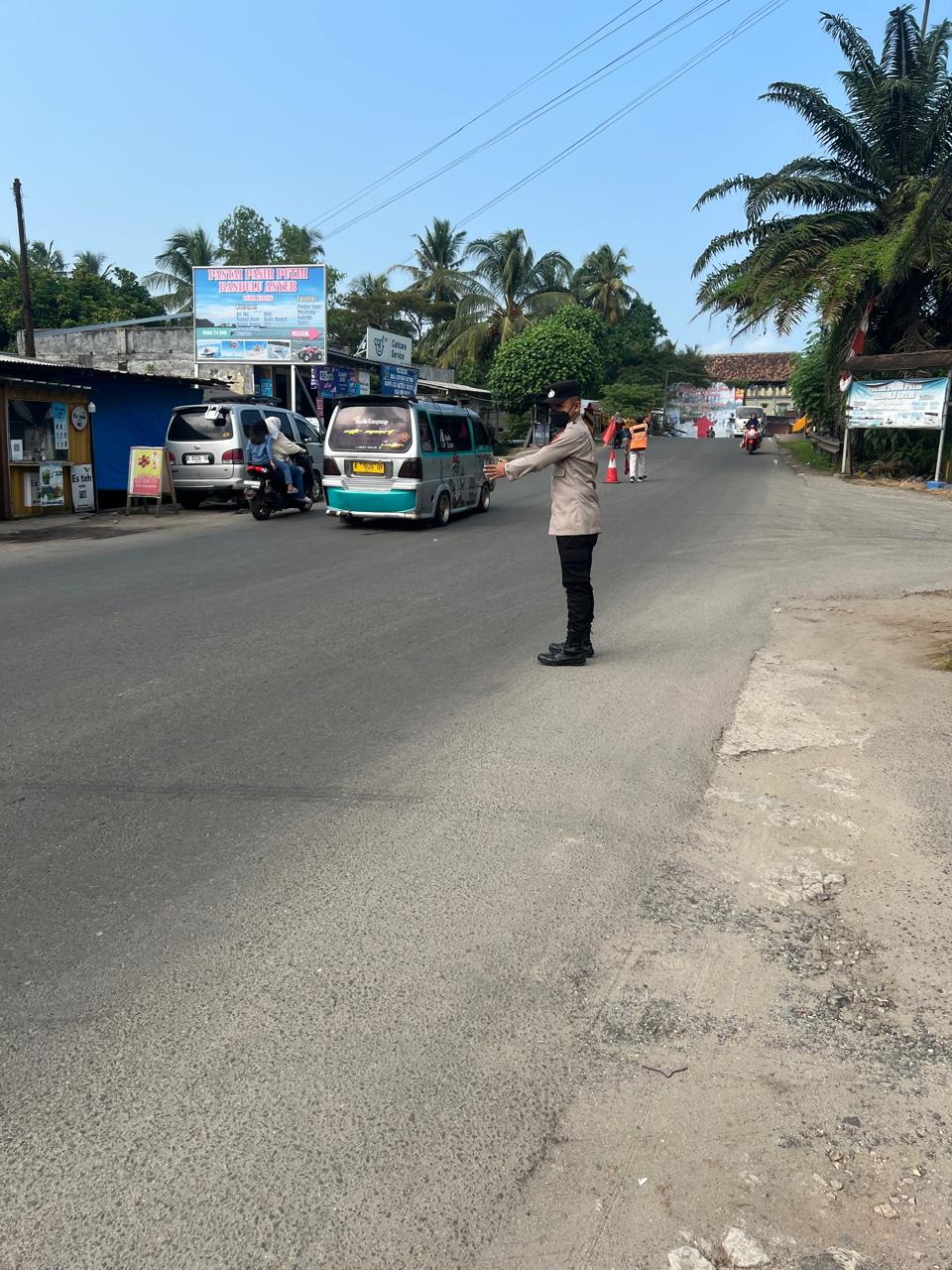 Anggota Siwas Polres Cilegon melaksanakan Pengaturan Arus Lalin atau Gatur Strong Point di arah jalur Wisata Pantai Anyer Banten.