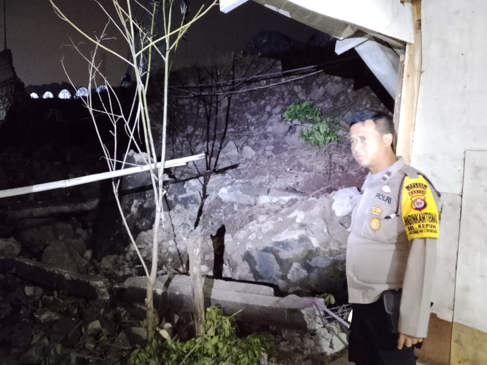 Cilegon - Bhabinkamtibmas, Babinsa Kel. Kepuh, Ketua LSM Ampuh, dan Lurah Kepuh melakukan pengecekan tembok belakang rumah warga dan gubung usaha di Link. Rombongan RT. 01/01 Kel. Kepuh, Ciwandan, Cilegon. Tembok rumah roboh tertimpa pondasi PT. KENERTEK POWER SISTEM pasca banjir pada Senin (05/01/2026).