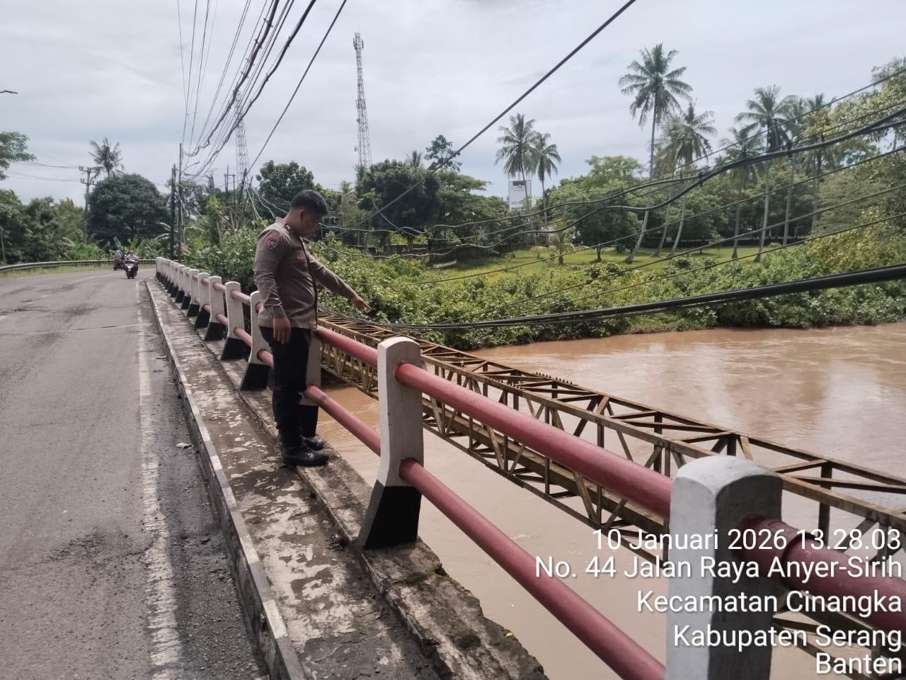 Piket Polsek Cinangka secara rutin melakukan pengecekan kondisi sungai dan berkoordinasi dengan pihak terkait untuk memantau perkembangan debit air. Pemantauan ini juga melibatkan partisipasi aktif dari masyarakat setempat.