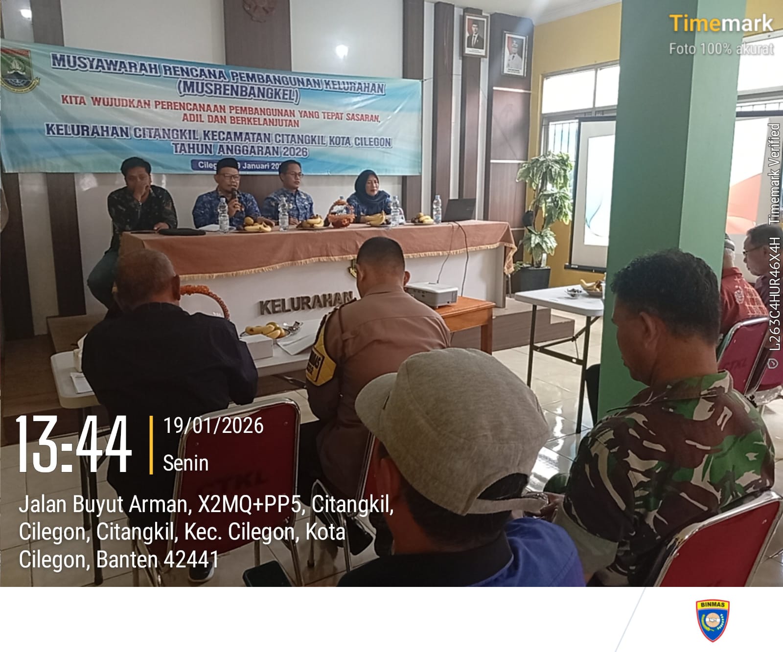 Cilegon - Bhabinkamtibmas Kelurahan Citangkil Polsek Ciwandan Polres Cilegon Polda Banten AIPDA Warudin Menghadiri kegiatan rapat Pra Musrenbangkel Tingkat Kelurahan yang bertempat di lingkungan Kelurahan Citangkil kecamatan Citangkil kota Cilegon, Senin (19/01/2026).