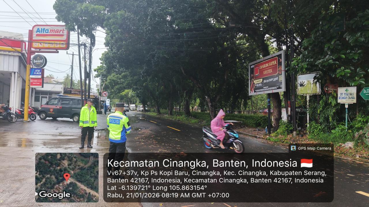 *Polres Cilegon* - Dalam Mewujudkan Aksi Nyata Pelayanan Kepada Masyarakat,Personil Polsek Cinangka Polres Cilegon Polda Banten Laksanakan Strong Poin Pengaturan Lalu-lintas, Kamis (22/01/2026).