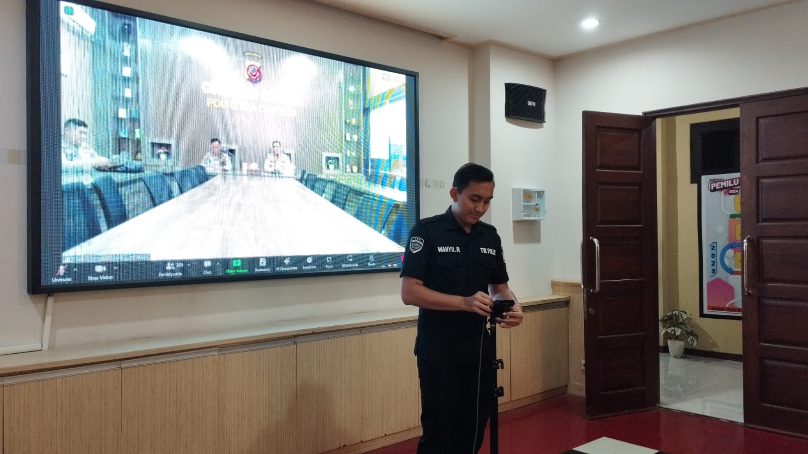 Anggota Tik Polres Cilegon Menyiapkan Sarana dan Prasarana Untuk Kegiatan Zoom meeting Dalam pelaksanaan kegiatan zoom meeting tersebut anggota TIK Polres Cilegon yang bertanggung jawab untuk menyiapkan peralatan zoom. Selain itu agar di tidak ada gangguan jaringan sebelum pelaksanaan anggota TIK melakukan pemeriksaan terhadap sarana dan prasarana tersebut . Satu jam sebelum kegiatan zoom meeting itu dimulai. Kapolres Cilegon AKBP. DR. MARTUA RAJA TARIPAR LAUT SILITONGA. melalui Kasi TIK IPTU Jajang Rohendi menyampaikan bahwa “untuk menunjang kelancaran penyampaian informasi anggota TIk Polres Cilegon selalu memeriksa sarana dan prasarana tersebut, sebelum maupun pada saat pelaksanaan akan selalu di monitor”