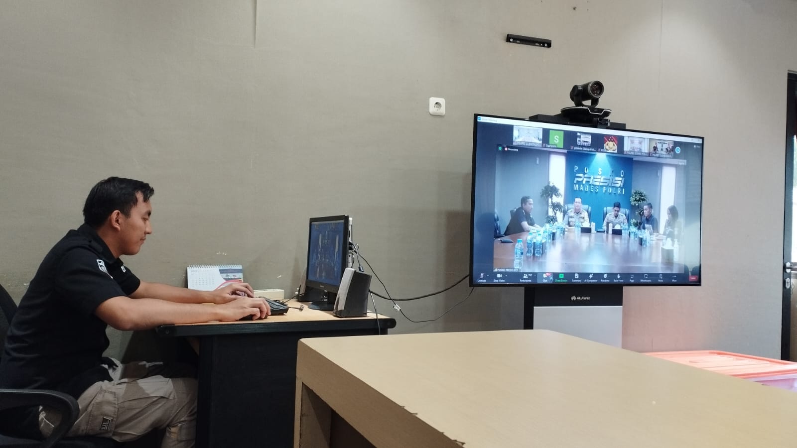 Anggota Tik Polres Cilegon Menyiapkan Sarana dan Prasarana Untuk Kegiatan Zoom meeting Dalam pelaksanaan kegiatan zoom meeting tersebut anggota TIK Polres Cilegon yang bertanggung jawab untuk menyiapkan peralatan zoom. Selain itu agar di tidak ada gangguan jaringan sebelum pelaksanaan anggota TIK melakukan pemeriksaan terhadap sarana dan prasarana tersebut . Satu jam sebelum kegiatan zoom meeting itu dimulai. Kapolres Cilegon AKBP. DR. MARTUA RAJA TARIPAR LAUT SILITONGA. melalui Kasi TIK IPTU Jajang Rohendi menyampaikan bahwa “untuk menunjang kelancaran penyampaian informasi anggota TIk Polres Cilegon selalu memeriksa sarana dan prasarana tersebut, sebelum maupun pada saat pelaksanaan akan selalu di monitor”