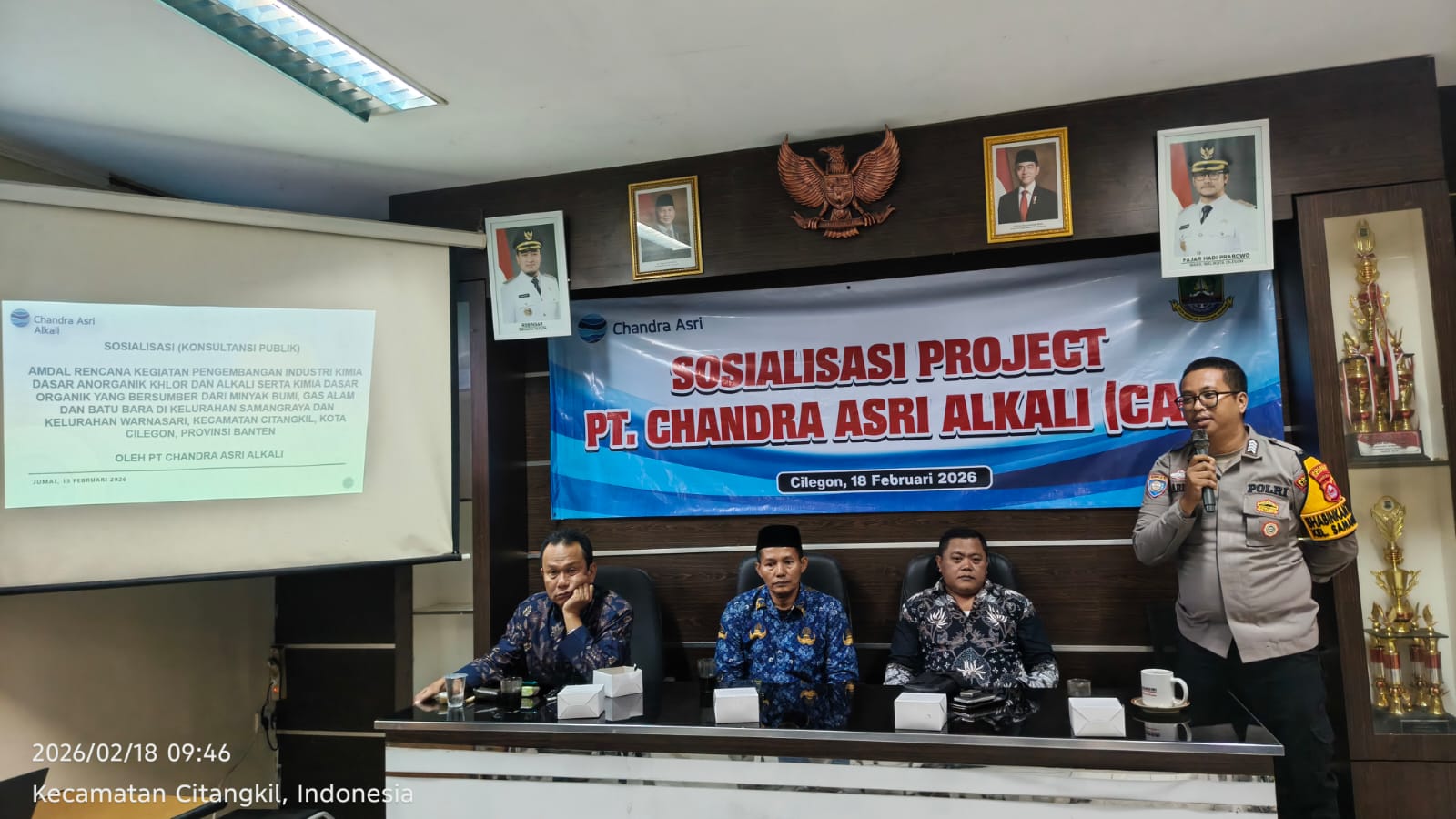 Kapolres Cilegon Polda Banten AKBP Dr. Martua Raja Taripar Laut Silitonga Melalui Kapolsek Ciwandan Polres Cilegon Polda Banten KOMPOL Achri Dwi Yunito Mengatakan Banhwa Kegiatan ini merupakan tindak lanjut dari Kelurahan Samangraya setelah pelaksanaan Sosialisasi Amdal PT CAA pada hari Jumat tanggal 13 Februari 2026. Tujuan kegiatan ini adalah untuk menyampaikan Sosialisasi Amdal PT CAA kepada Masyarakat Kel. Samangraya melalui Perangkat RW dan RT serta Karang Taruna dan Toga atau Tomas.