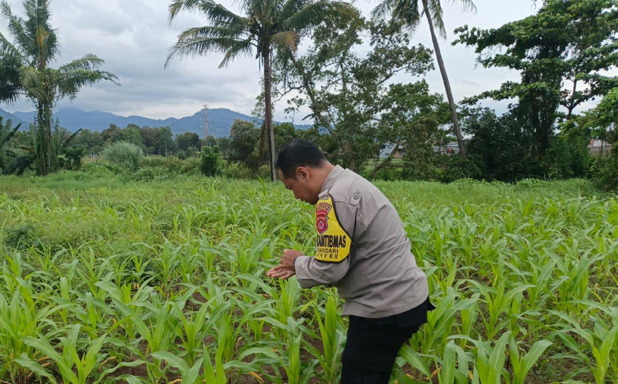 Dalam kegiatan monitoring ini, Bhabinkamtibmas meninjau langsung kondisi lahan jagung.