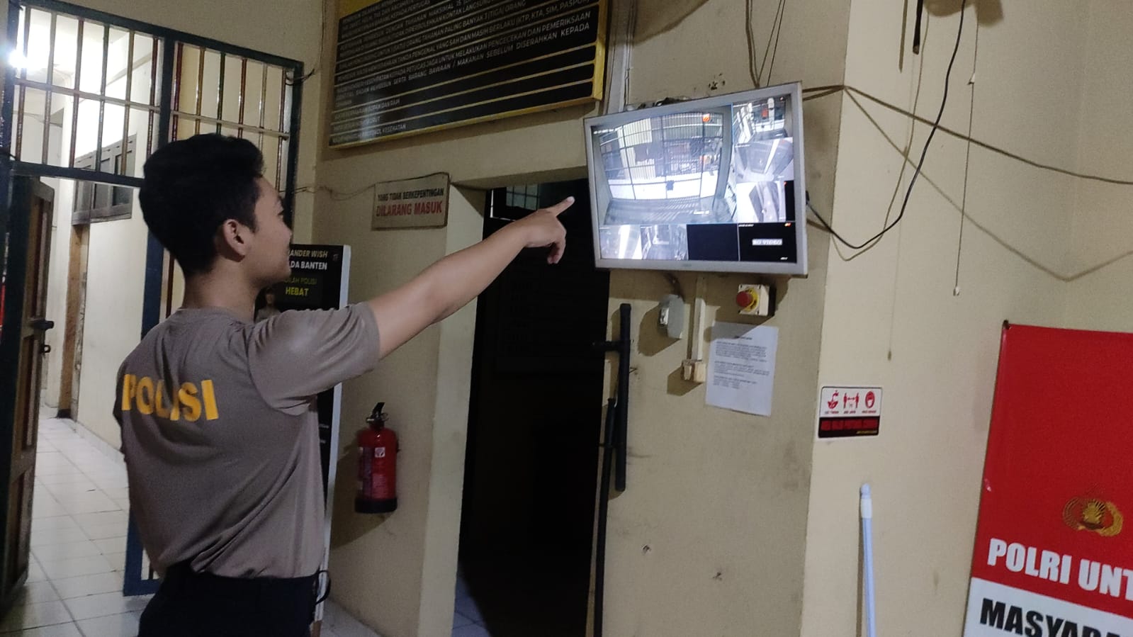 Personil Sat Tahti Cek Tahanan melalui CCTV yang ada di Rutan Polres Cilegon.