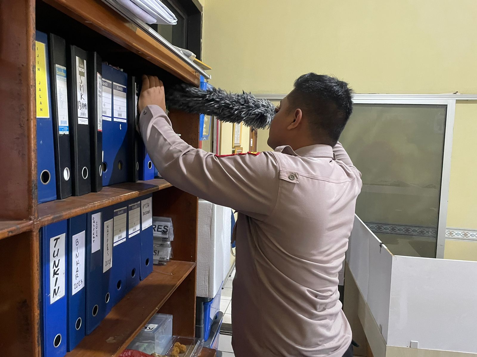 Anggota Bag SDM Polres Cilegon, Selallu dalam melaksankan kegiatan membersihkan ruangan kerja secara rutin.