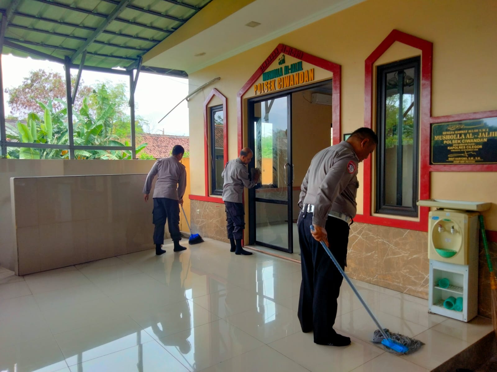 Personil Polsek Ciwandan dengan sigap membersihkan mushola, mulai dari membersihkan lantai, membersihkan kaca, hingga membersihkan tempat wudhu. Kegiatan ini juga diikuti oleh masyarakat sekitar yang ingin turut serta dalam menjaga kebersihan mushola.