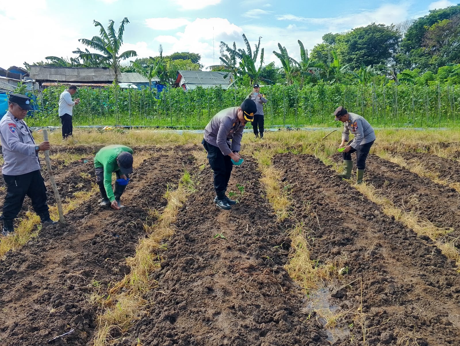 Penanaman jagung hibrida ini dilakukan di lahan seluas 0,5 Ha bersama Kelompok Tani Ketan Emas. Hadir dalam kegiatan ini Kapolsek Ciwandan, Panit 1 Binmas Polsek Ciwandan, Panit Opsnal Intelkam Polsek Ciwandan, dan Anggota Polsek Ciwandan.