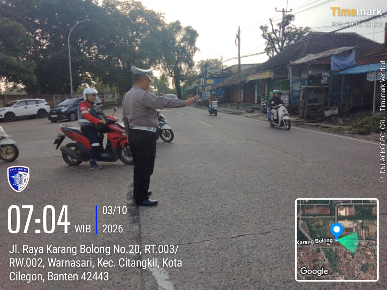 Cilegon - Guna Kelancaran Lalu-lintas Personil Unit Lantas Polsek Ciwandan Polres Cilegon Polda Banten melaksanakan pengaturan lalu-lintas di Simpang Beringin Ciwandan Pertigaan Kawasan Industri KSP/ KIEC I  kelurahan Warnasari Kecamatan Citangkil Kota Cilegon, Senin (09/03/2026).