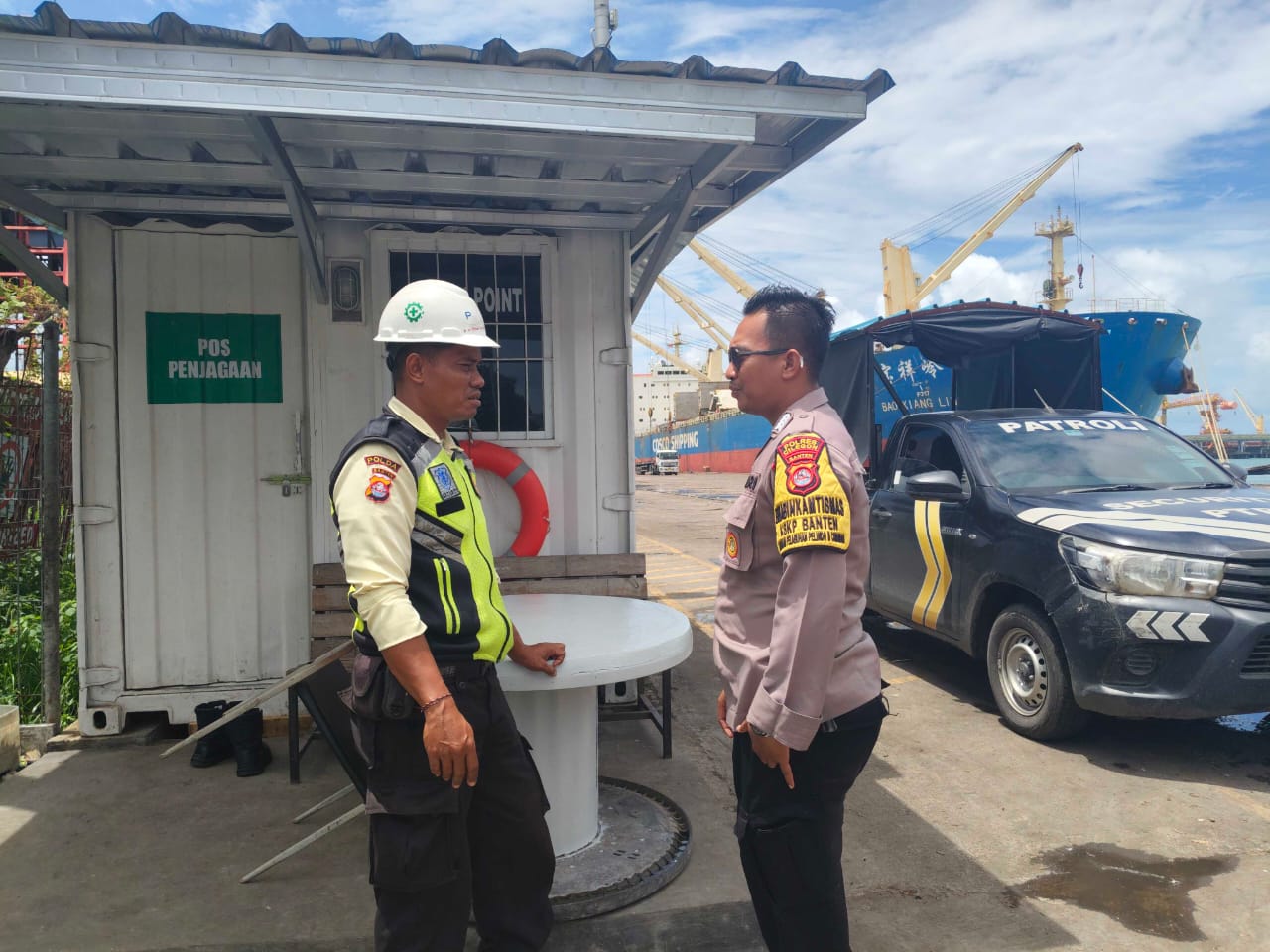 Kapolres Cilegon Polda Banten AKBP Martua Raja Taripar Laut Melalui Kapolsek Kskp Banten Polres Cilegon Polda Banten AKP Fredo Leonard Mengatakan Personil Polsek Kskp Banten Rutin menyambangi anggota Security dan memberikan himbauan agar para anggota Security bisa melaksanakan tugas menjaga keamanan di lingkungan Kawasan Pelabuhan.