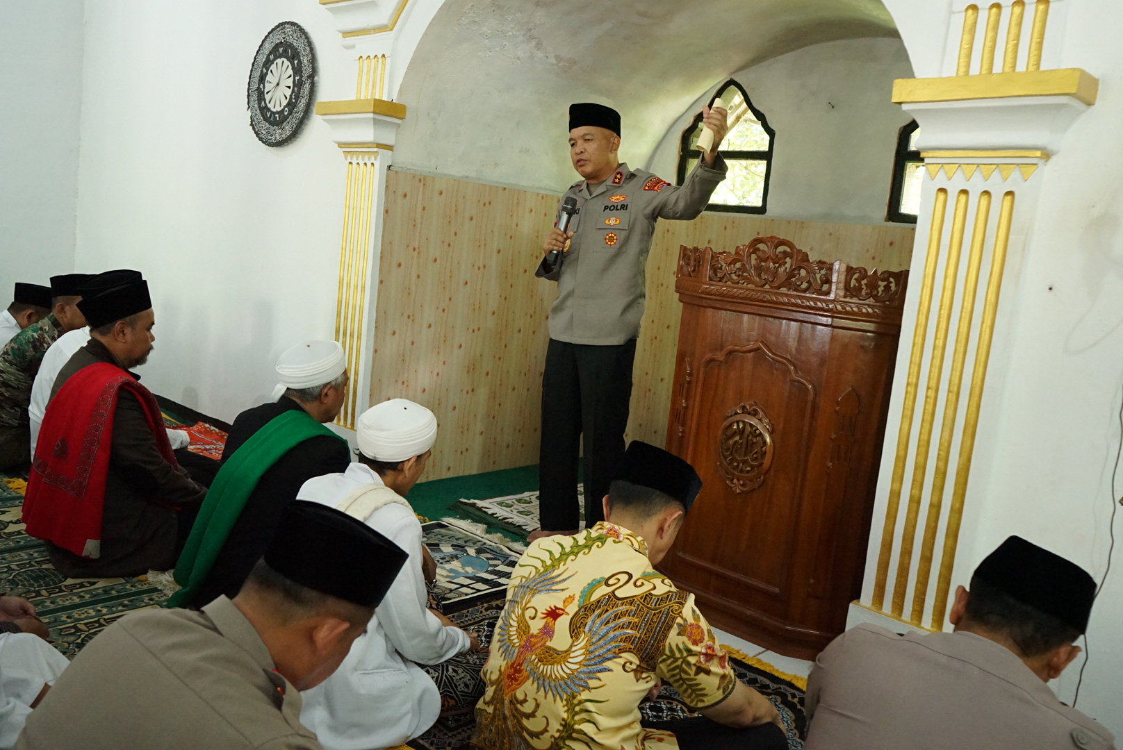 Cilegon –Kapolres Cilegon AKBP Dr Martua Raja Taripar Laut Silitonga S.H S.IK M.S.I mendampingi Kapolda Banten Irjen Pol Hengki S.IK,M.H melaksanakan kegiatan Salat Jumat Keliling (Jumling) di Masjid Miftahul Huda, Pondok Pesantren TQN Al-Mubarok, Kampung Pasir Angin, Desa Cinangka, Kecamatan Cinangka, Kabupaten Serang ,Jumat 10/4/26 Kegiatan tersebut diikuti oleh para Pejabat Utama Polda Banten dan pejabat utama Polres Cilegon, tokoh agama, tokoh masyarakat, serta para jamaah salat Jumat. Dalam kesempatan tersebut, Kapolda Banten menyampaikan bahwa program Salat Jumat Keliling merupakan salah satu upaya Polri untuk lebih mendekatkan diri dengan masyarakat sekaligus mempererat silaturahmi. “Program Salat Jumat Keliling ini merupakan ikhtiar kami untuk mempererat silaturahmi dan menghadirkan Polri di tengah masyarakat, tidak hanya dalam tugas, tetapi juga berbagi rasa dalam suka dan duka,” ujar Kapolda Banten. Kapolda Banten juga menyampaikan bahwa situasi kamtibmas di wilayah Banten saat ini dalam keadaan aman dan kondusif. “Alhamdulillah, situasi kamtibmas di Banten saat ini aman dan kondusif, sehingga masyarakat dapat melaksanakan ibadah dengan tenang,” lanjutnya. Selain itu, Kapolda Banten mengingatkan bahwa ke depan tantangan kamtibmas akan semakin kompleks seiring perkembangan teknologi dan informasi. “Kami menghimbau masyarakat agar waspada terhadap penyebaran hoaks, ujaran kebencian, provokasi isu SARA, kejahatan berbasis teknologi, serta penyalahgunaan narkoba,” tegasnya. Lebih lanjut, Kapolda turut mengajak masyarakat untuk tidak mudah terprovokasi dan lebih bijak dalam menggunakan media sosial, serta menjaga persatuan dan kerukunan. “Mari kita bersama-sama menjaga persatuan dan meningkatkan toleransi antar umat beragama demi terciptanya situasi yang aman dan damai,” tambahnya. Diakhir, Kapolda Banten mengajak masyarakat untuk memanfaatkan layanan kepolisian. “Saya mengajak seluruh masyarakat untuk memanfaatkan layanan kepolisian, salah satunya layanan Call Center 110 yang aktif 24 jam secara gratis. Melalui layanan ini, masyarakat dapat dengan mudah melaporkan setiap gangguan kamtibmas maupun kejadian yang membutuhkan kehadiran polisi, sehingga dapat segera ditindaklanjuti secara cepat, tepat oleh petugas,” tutup Kapolda Banten. Hadir dalam kegiatan tersebut untuk.pejabat utama Polda Banten 1). Dirreskrimum Polda Banten KOMBES POL. DIAN SETYAWAN, S.H., S.I.K., M.Hum 2). Dirbinmas Polda Banten KOMBES POL IMAM TARMUDI, S.I.K., M.H. 3). Dirlantas Polda Banten Kombes Pol. Arief Kurniawan, S.I.K. 4). Kabid Humas Polda Banten KOMBES POL. Maruli Ahiles Hutapea, S.I.K. 5). Kabid Propam Polda Banten KOMBES POL. MURWOTO, S.H., S.I.K., M.H. 6). Dirintel Polda Banten KOMBES POL. ATOT IRAWAN, S.I.K., M.M 8). Kapolres Cilegon AKBP Dr. MARTUA RAJA TARIPAR LAUT SILITONGA, S.H, S.Ik, M.Si. Pejabat Utama Polres Cilegon 1). Wakapolres Cilegon KOMPOL M. RIZKI SALATUN, S.IK. 2). Kabag SDM Polres Cilegon KOMPOL ENTANG CAHYADI, S.H., M.A 3). Kabaglog Polres Cilegon AKP SUDIBYO WARDOYO, S.H, M.M 4). Kasat Sabhara Polres Cilegon AKP AGUS HENDRATNO 5). Kasat Lantas Polres Cilegon AKP RIDWAN S.TK., S.I.K., M.H 6). Kasi Humas Polres Cilegon AKP SIGIT DERMAWAN, S.H. 7). Kasie Propam Polres Cilegon AKP HERI SUSANTO, S.H, M.M. 8). Kapolsek Cinangka AKP RUSNATA, S.H., S.KOM. 9). Kasiwas Polres Cilegon IPTU HARIS SURAHMAN 10). Kasat Intelkam Polres Cilegon IPTU RISWAN WIJAYA, S.H Tokoh masyarakat 1). Pimpinan Ponpes TQN Al Mubarok KH.RD.M.YUSUF PRIANADI,SH 2). Tokoh Agama Pimpinan Ponpes Nur Sejati KH.DAMANHURI 3). Ketua DPC NU Kec.Cinangka USTADZ.DAMAN