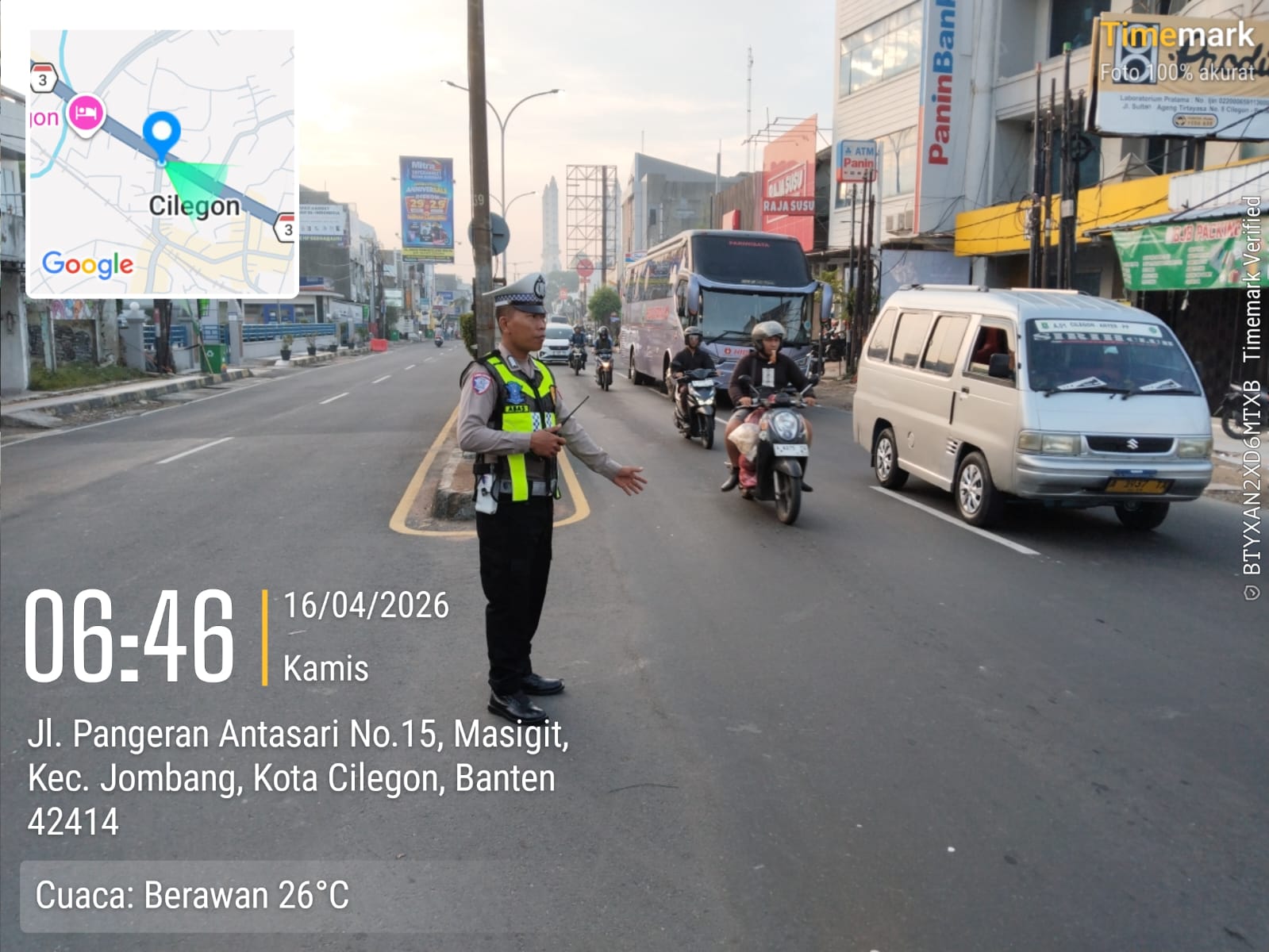 Cilegon, Satlantas Polres Cilegon Polda Banten – Berikan pelayanan kepada masyarakat Kasat lantas Polres Cilegon AKP Ridwan memerintahkan jajaran lalulintas untuk melaksanakan pengaturan lalu lintas di penggal – penggal jalan yang rawan kemacetan di Kota Cilegon, (Kamis,16/4/2026)