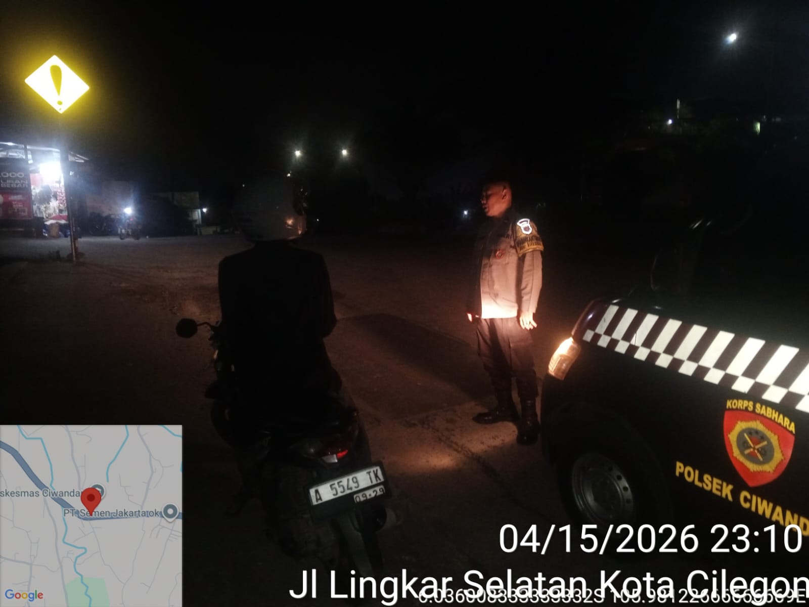 Cilegon - Personil Polsek Ciwandan Polres Cilegon Polda Banten Dalam Pelaksanaan Kegiatan Patroli dengan menyalakan lampu rotator berwarna biru di Daerah Hukum Polsek Ciwandan Polres Cilegon Polda Banten dari malam hingga dini hari, dalam rangka menciptakan situasi aman dan kondusif, Kamis (16/04/2026).