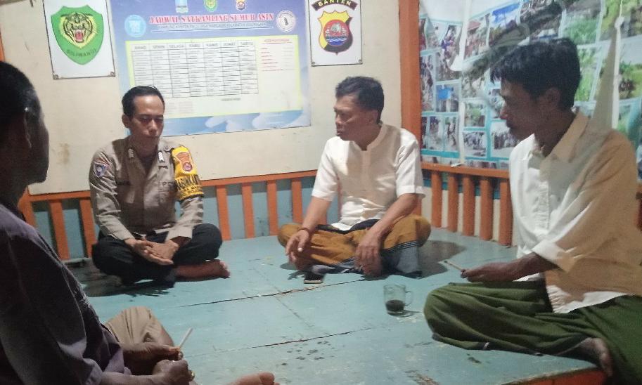 Patroli Nyisir Satkamling Edukasi Kamtibmas, Bhabinkamtibmas Polsek Bojonegara Polres Cilegon Datangi Warga Sedang Ronda Berikan Sosialisasi Call Center 110