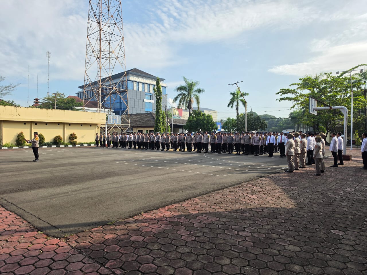 Personil Polres Cilegon ikuti Apel jam pimpinan di Lapangan Apel Satya Haprabu Polres Cilegon. Senin, 27/04/2026.