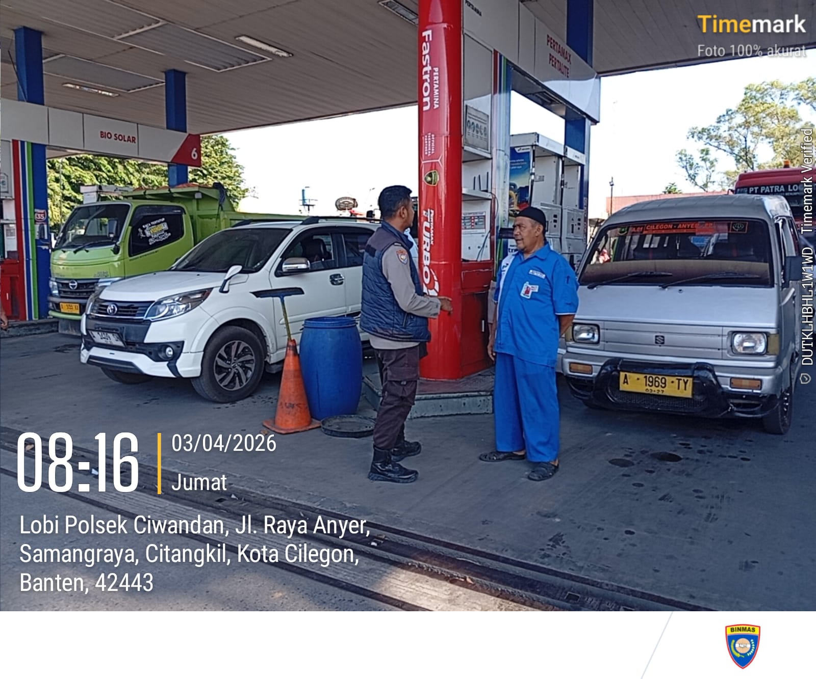 Cilegon - Kepolisian Polsek Ciwandan Polres Cilegon Polda Banten, melakukan pengecekan stok Bahan Bakar Minyak (BBM) di dua SPBU di wilayah Ciwandan, Cilegon, Jum'at (03/04/2026).Kapolres Cilegon Polda Banten AKBP Dr. Martua Raja Taripar Laut Silitonga Melalui Kapolsek Ciwandan Polres Cilegon Polda Banten KOMPOL Achri Dwi Yunito Mengatakan Bahwa Pengecekan ini dilakukan...