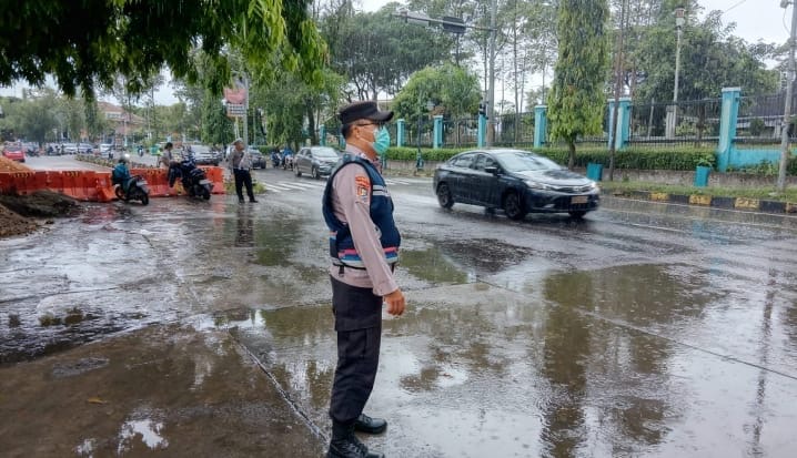 Personel Polsek Purwakarta Strong Point bekerja sama dengan anggota Satuan Lalu Lintas Polres Cilegon melakukan pengaturan lalu lintas di Persimpangan ADB, Kelurahan Ramanuju