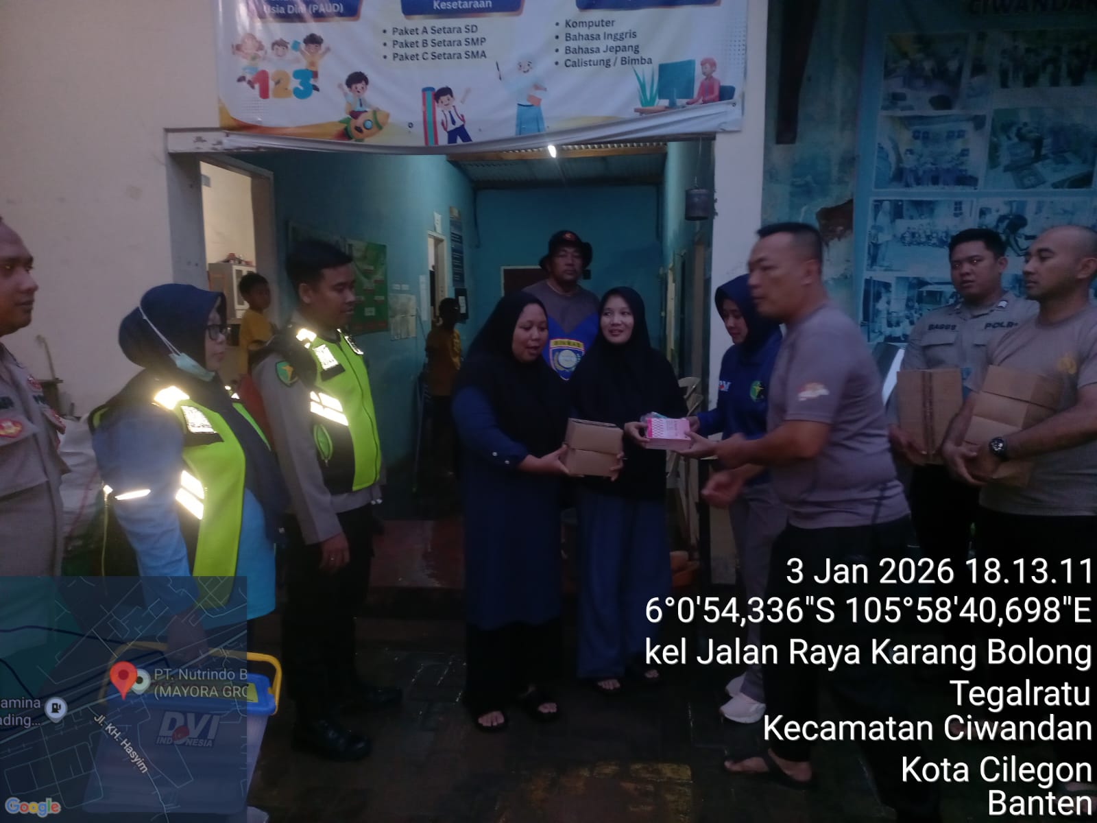Kapolsek Ciwandan, Kasat Binmas, Kasi Dokkes, dan Anggota Baglog Logistik turut serta dalam aksi bantuan. Warga yang terdampak sebagian mengungsi di Musholla setempat.