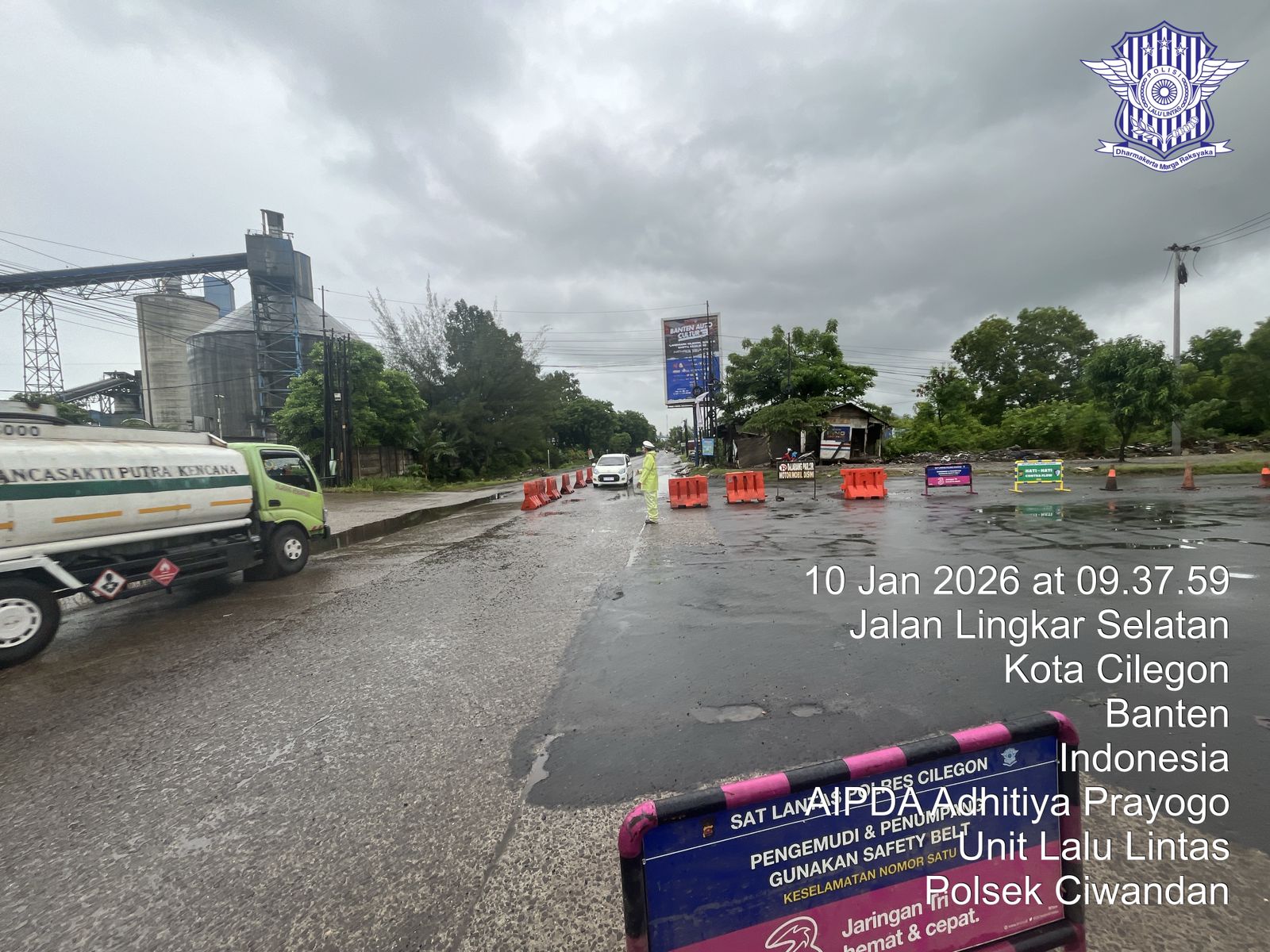Cilegon - Personil Unit Lantas Polsek Ciwandan Polres Cilegon Polda Banten melaksanakan kegiatan monitoring jalur wisata di depan Pos Lantas JLS Ciwandan, Sabtu (10/01/2026).