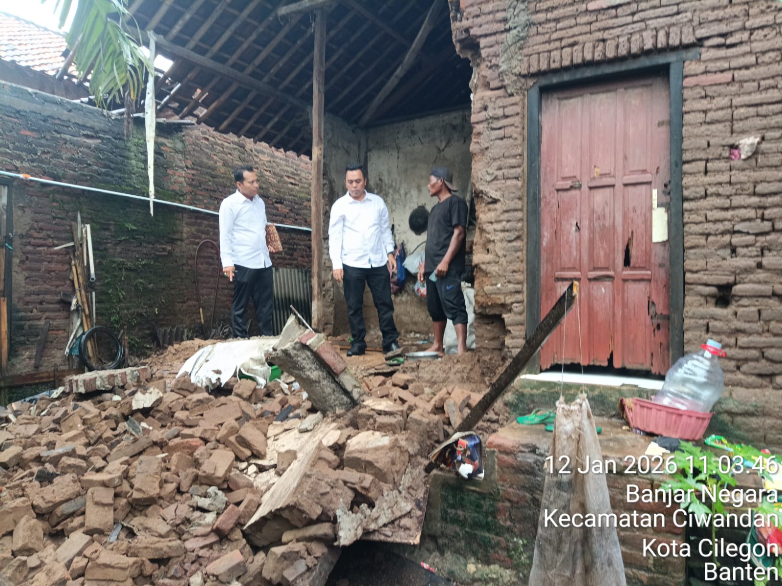 Cilegon - Personil Polsek Ciwandan Polres Ciegon Polda Banten Mengecek Dan Monitoring Sebuah rumah di Lingkungan Temugiring RT 002 RW 001 Kelurahan Banjarnegara Kecamatan Ciwandan Kota Cilegon Yang rubuh akibat hujan deras yang disertai angin pada Senin (12/01/2026).