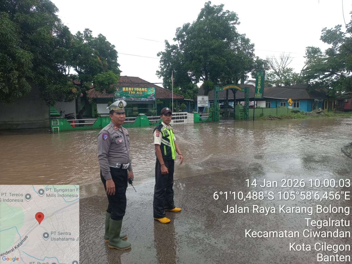 Cilegon - Personil Polsek Ciwandan melaksanakan monitoring genangan air dampak cuaca hujan lebat di wilayah hukum Polsek Ciwandan, Rabu (14/01/2026).