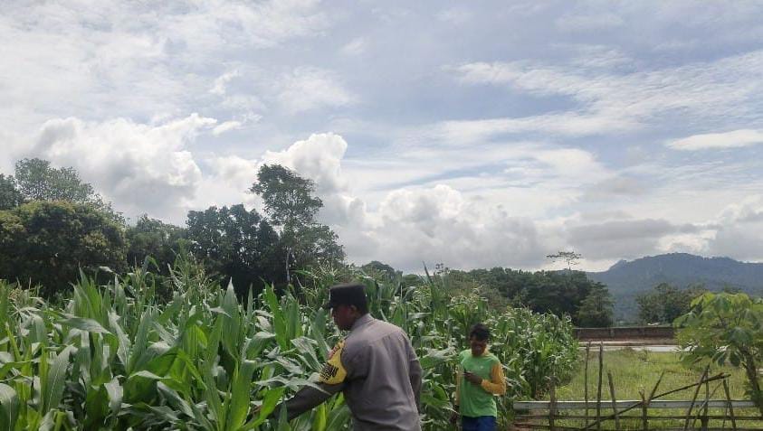 Dalam kegiatan monitoring ini, Bhabinkamtibmas meninjau langsung kondisi lahan jagung.