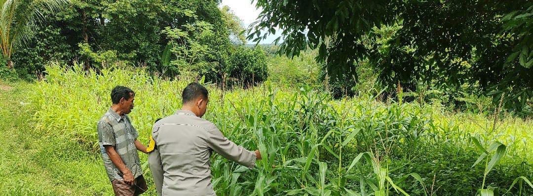 Dalam kegiatan monitoring ini, Bhabinkamtibmas meninjau langsung kondisi lahan jagung.